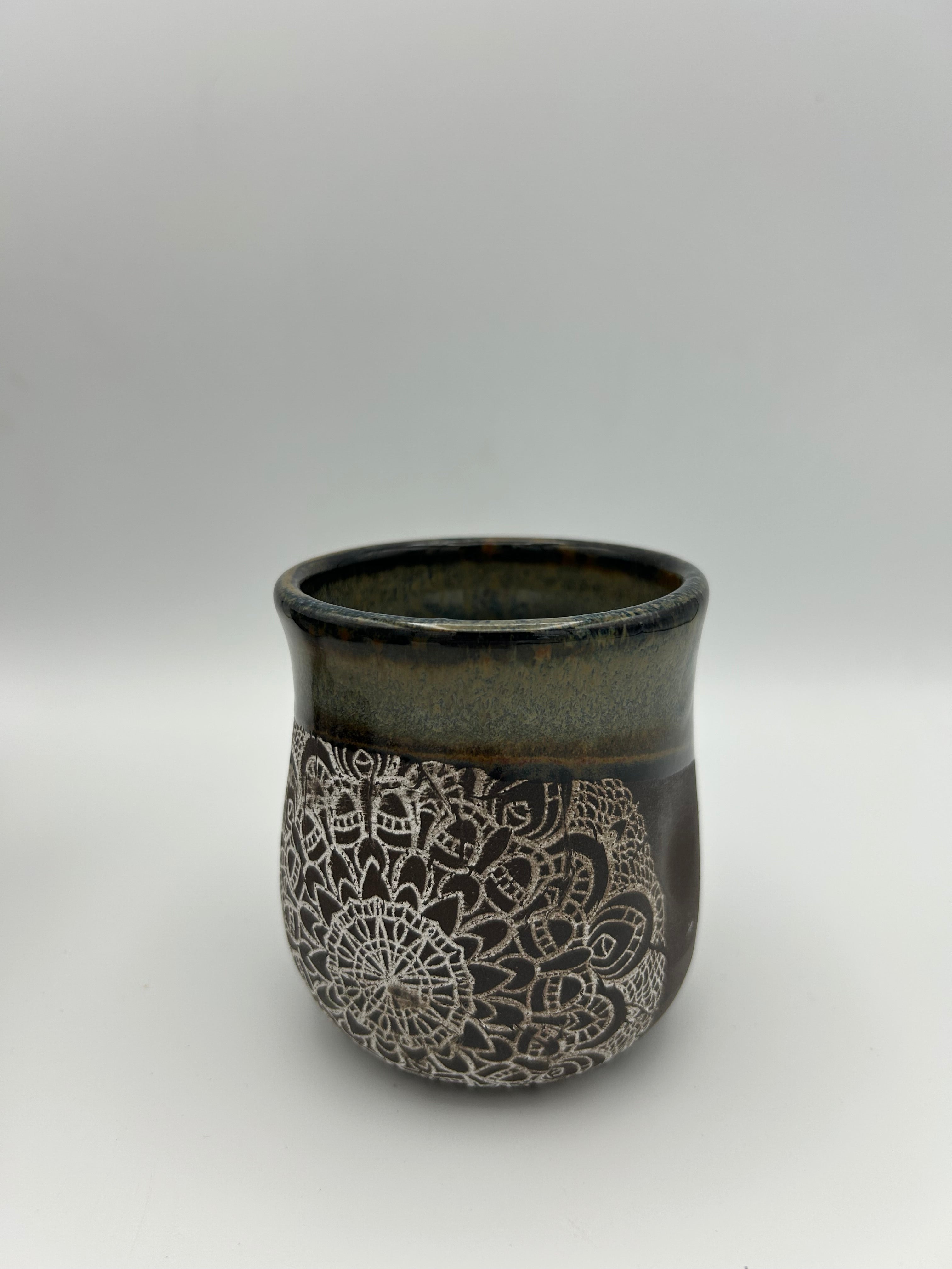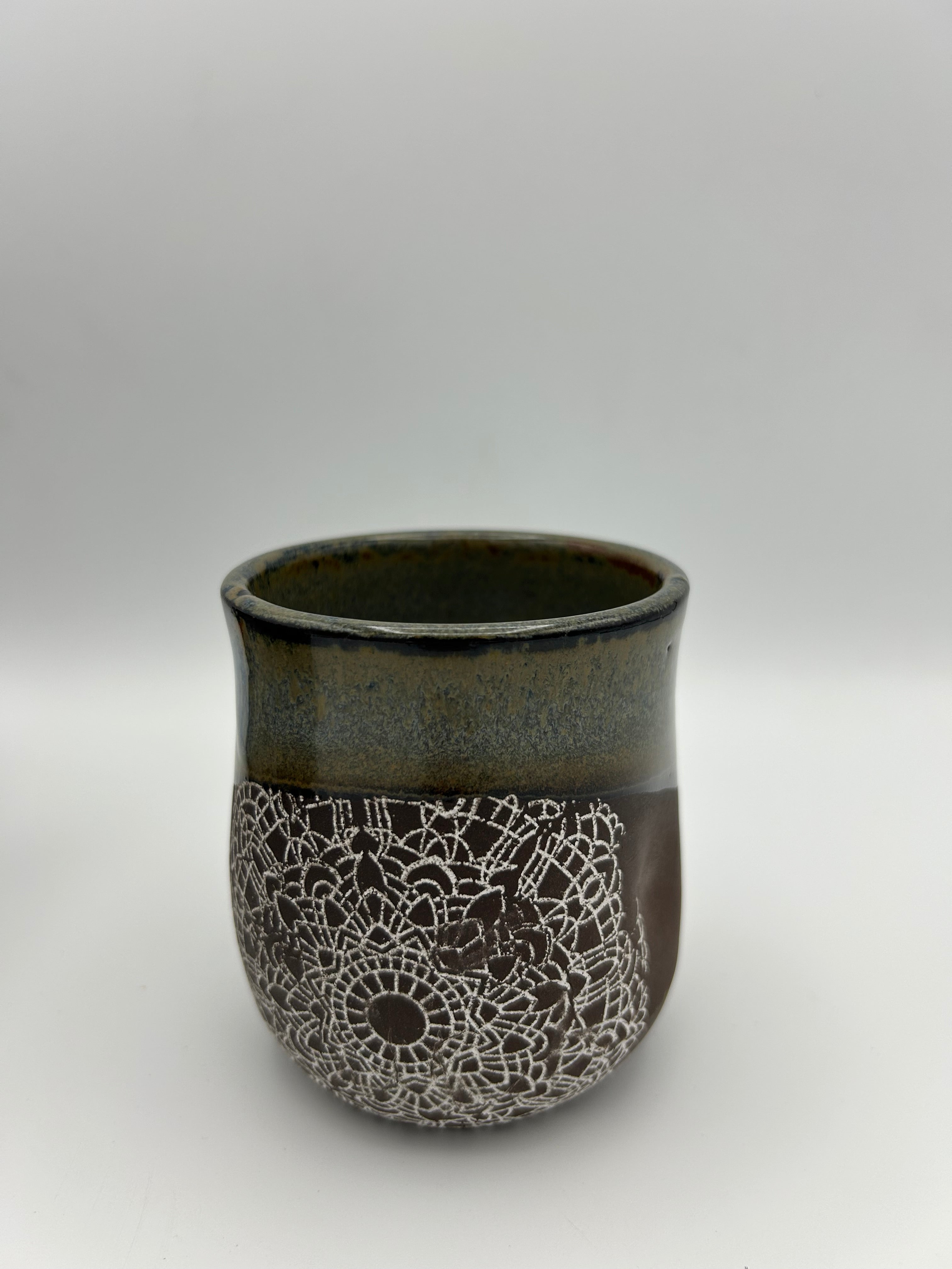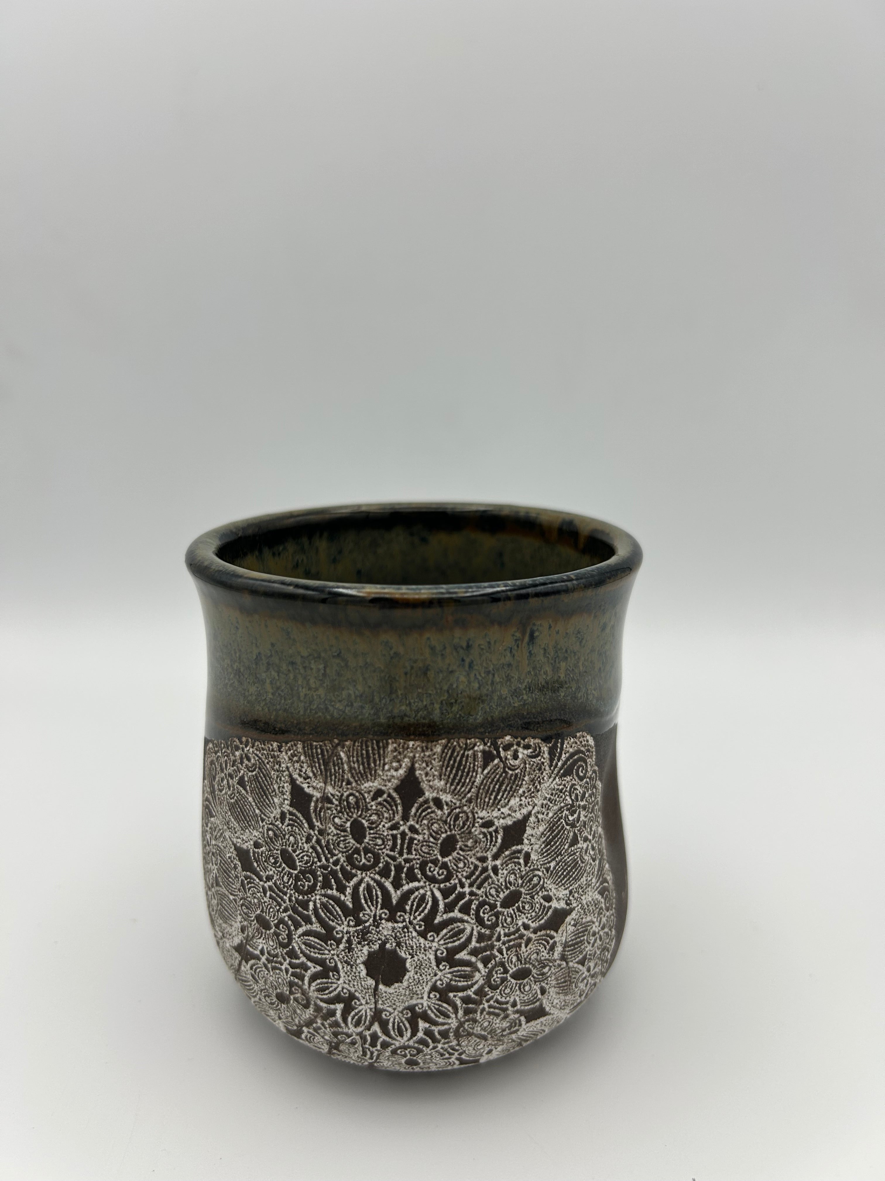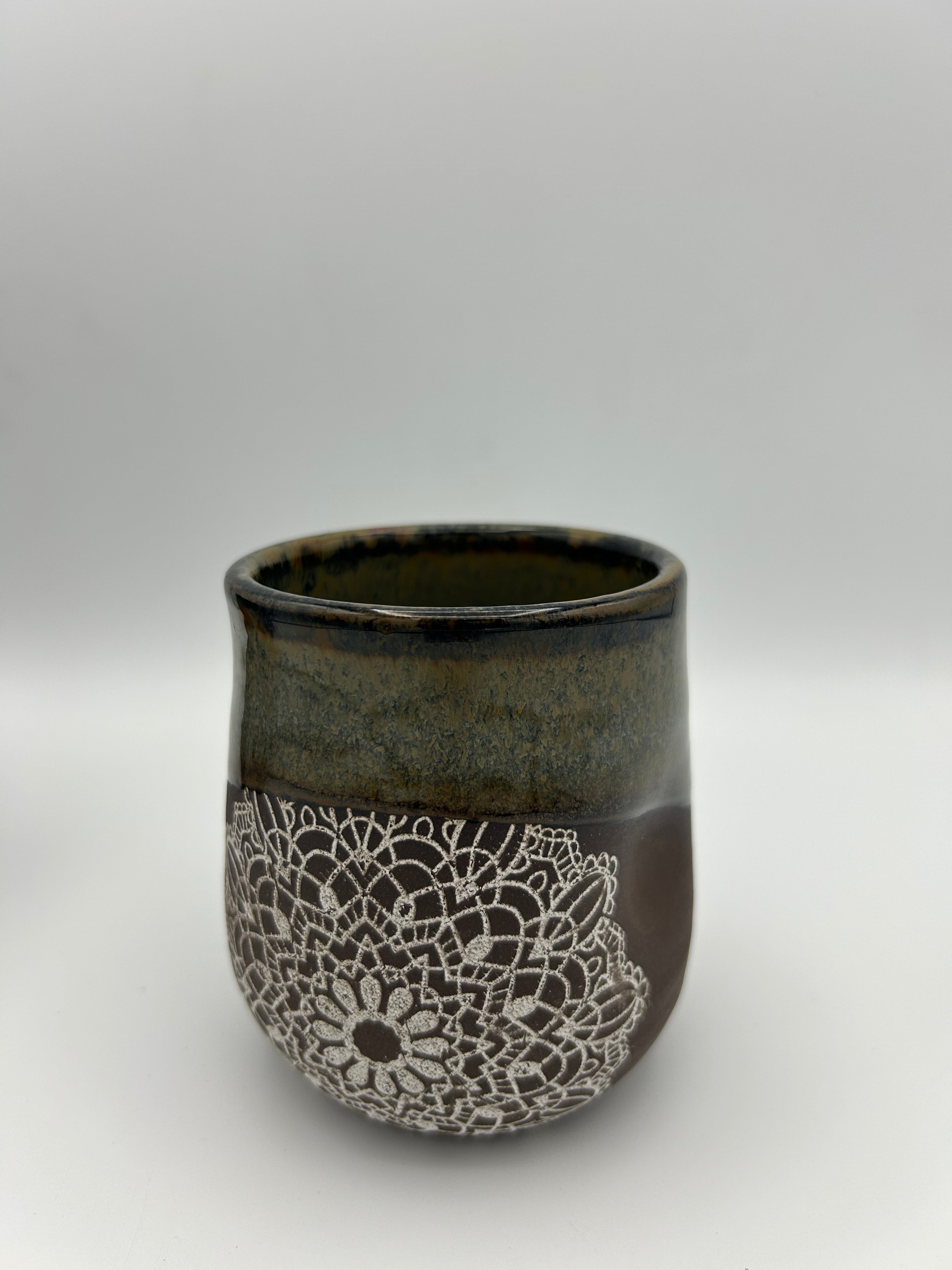 This vintage-style tumbler is adorned with intricate lace. Enjoy your favorite hot or cold beverages in a classic and elegant style.