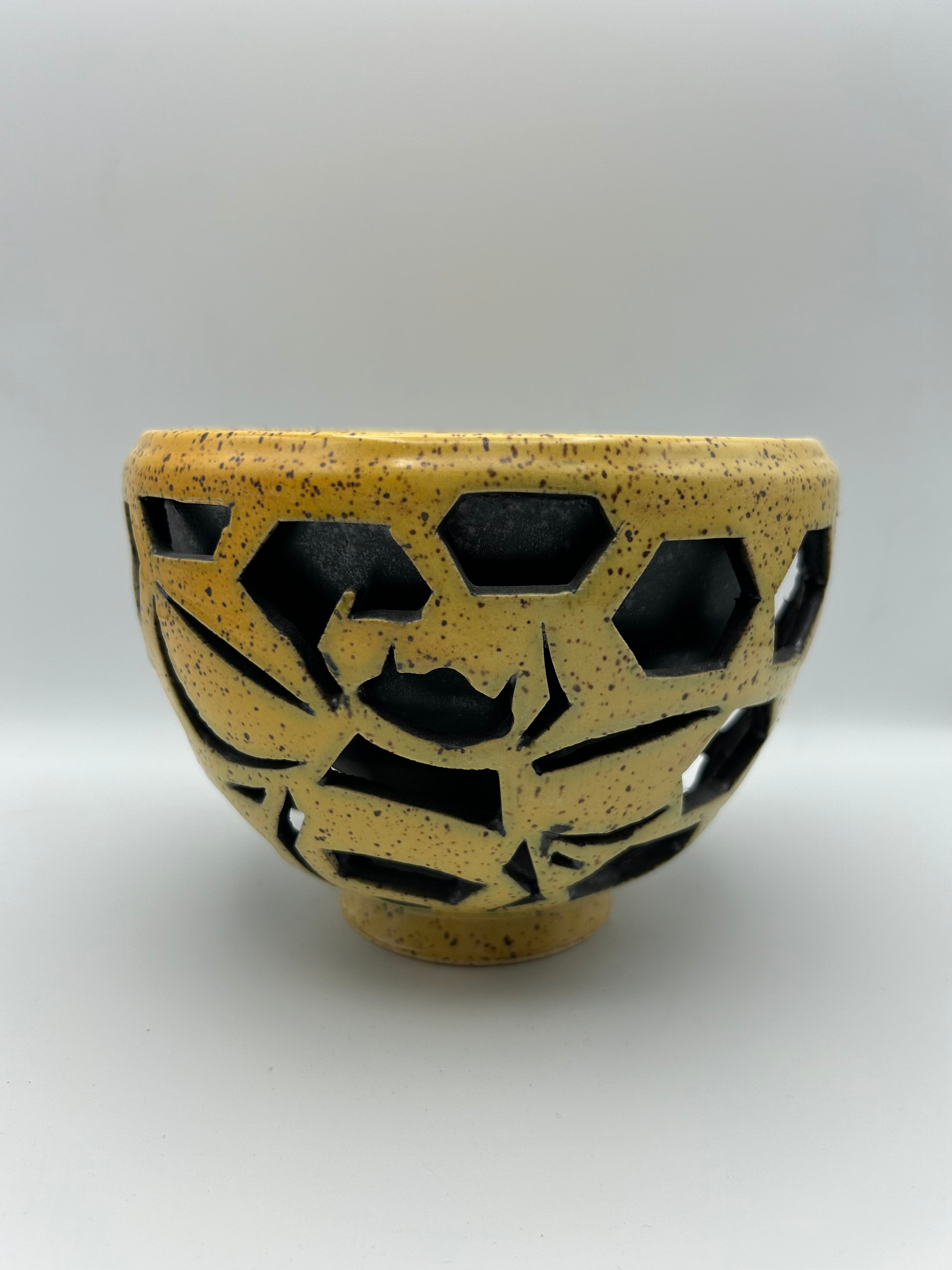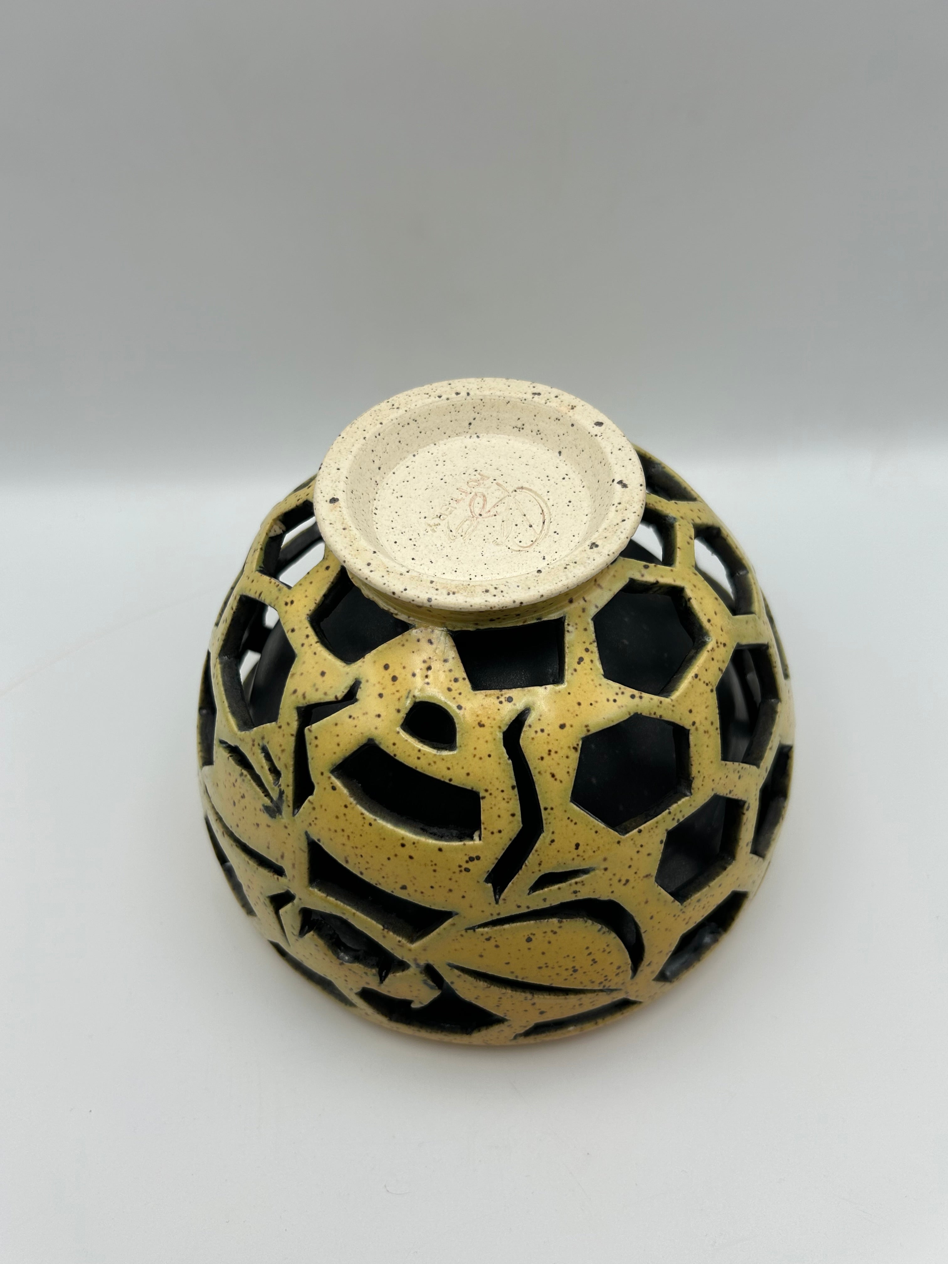 These bowls are thrown in two parts then attached at the rim. The outer bowl is then carved with an intricate design. Use for serving or just for decoration.