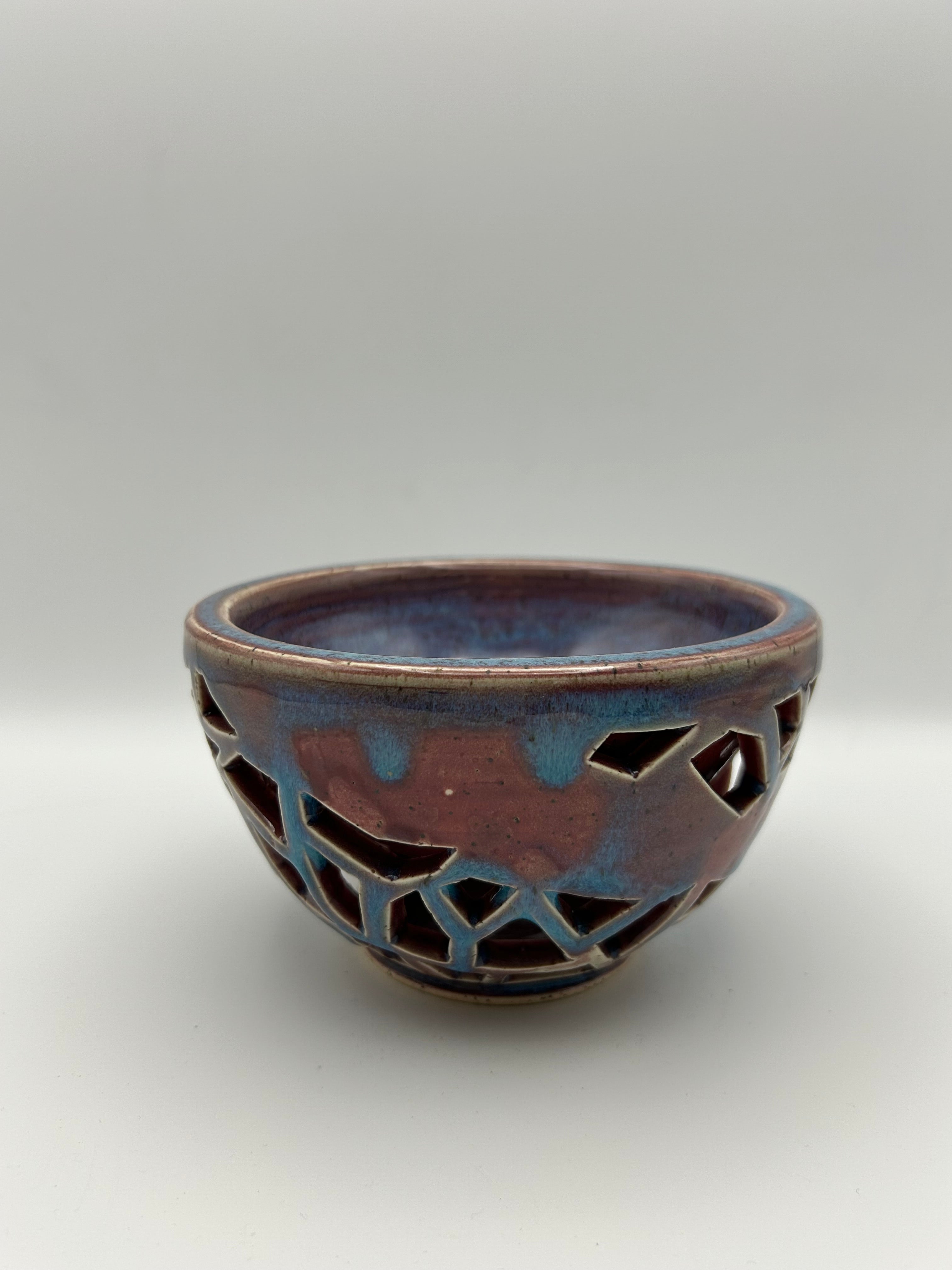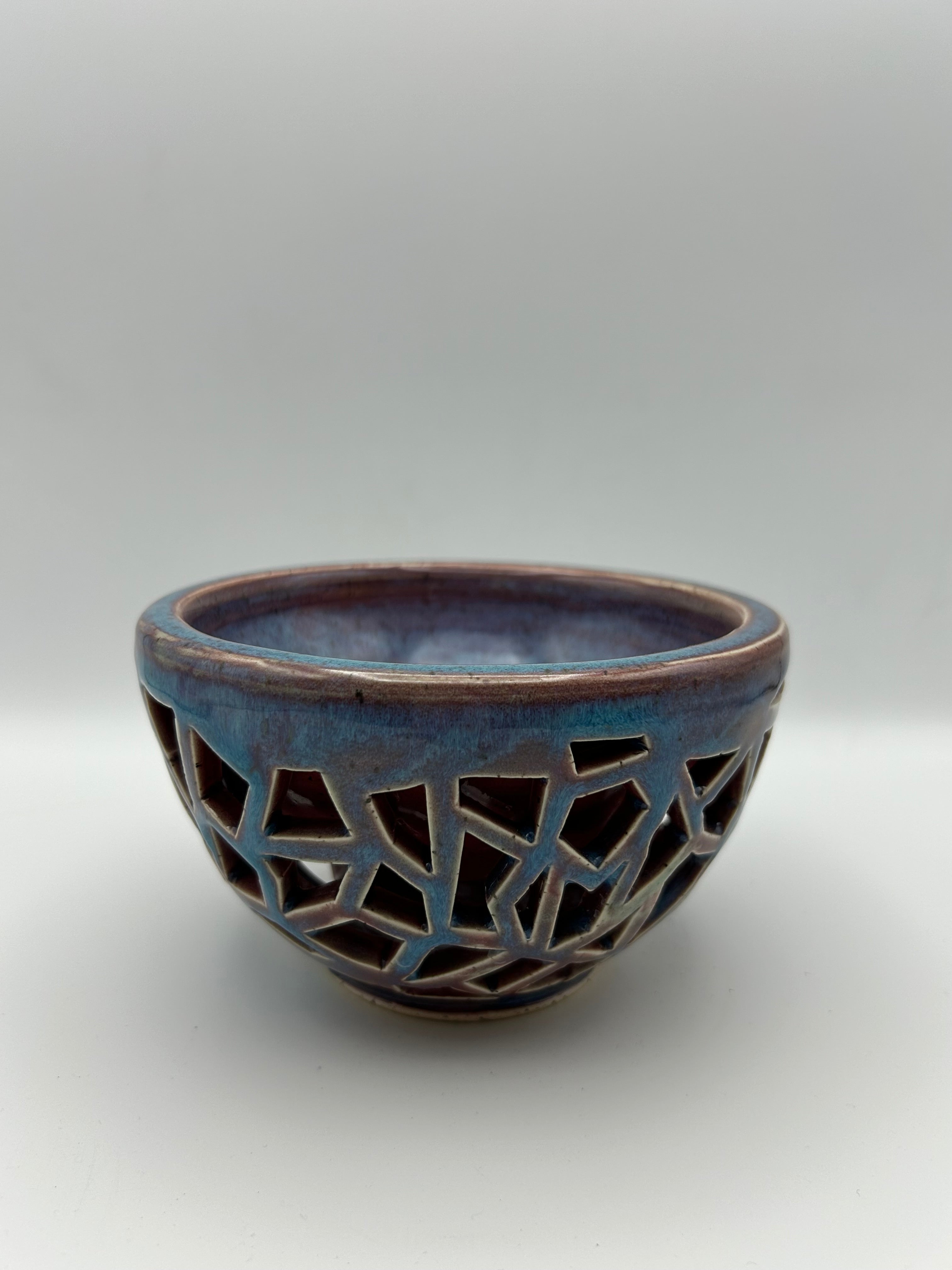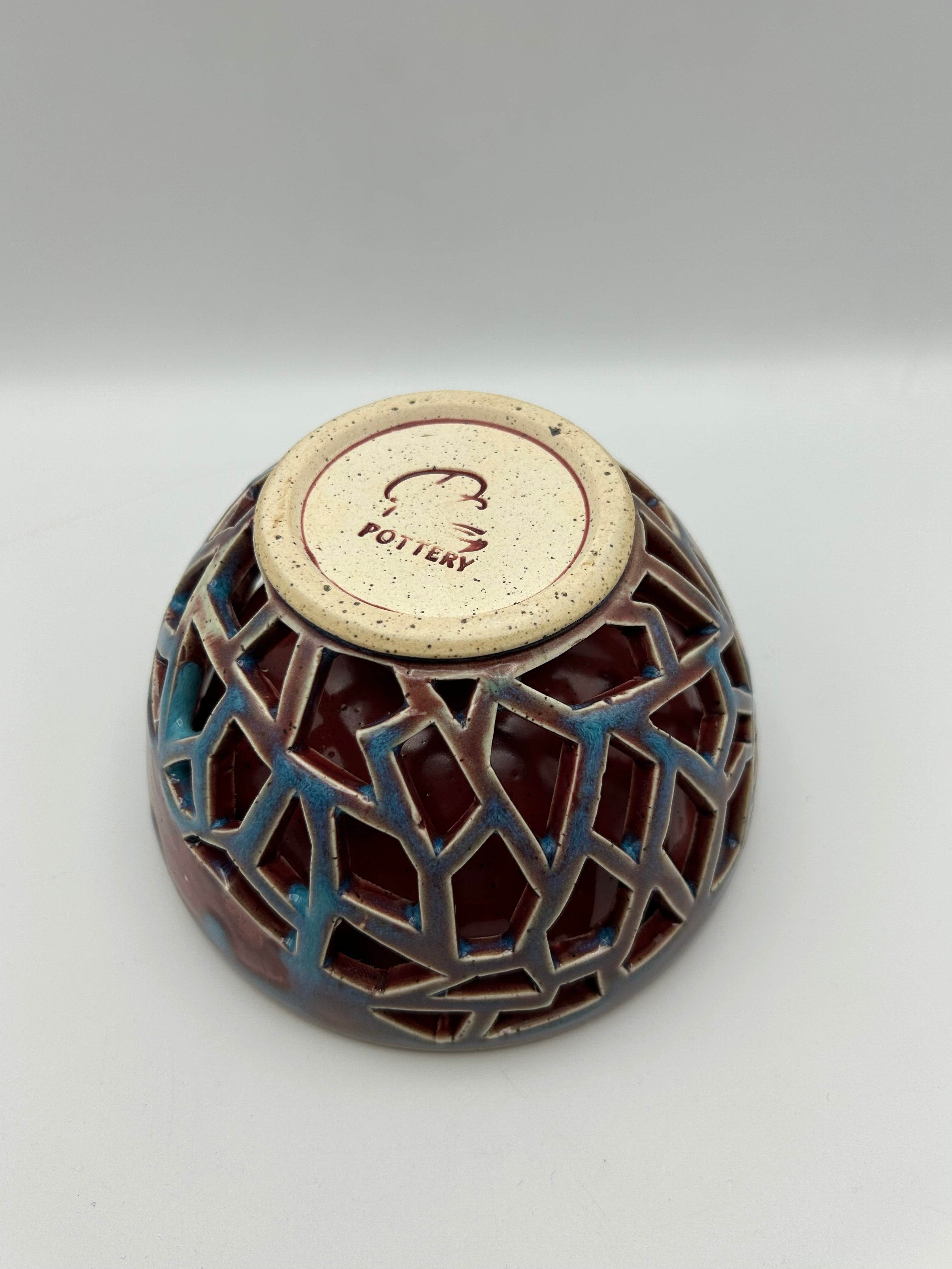 These bowls are thrown in two parts then attached at the rim. The outer bowl is then carved with an intricate design. Use for serving or just for decoration.