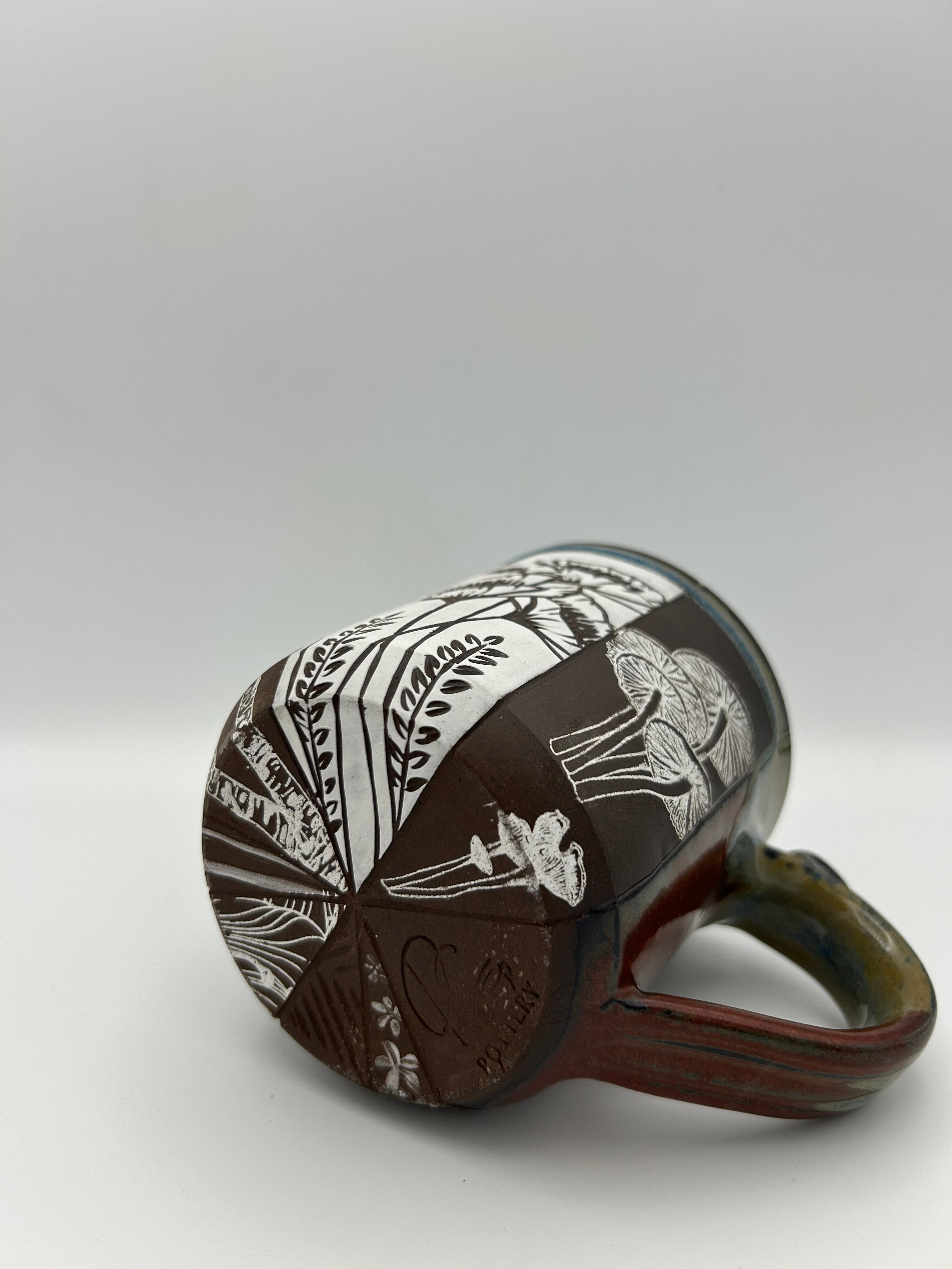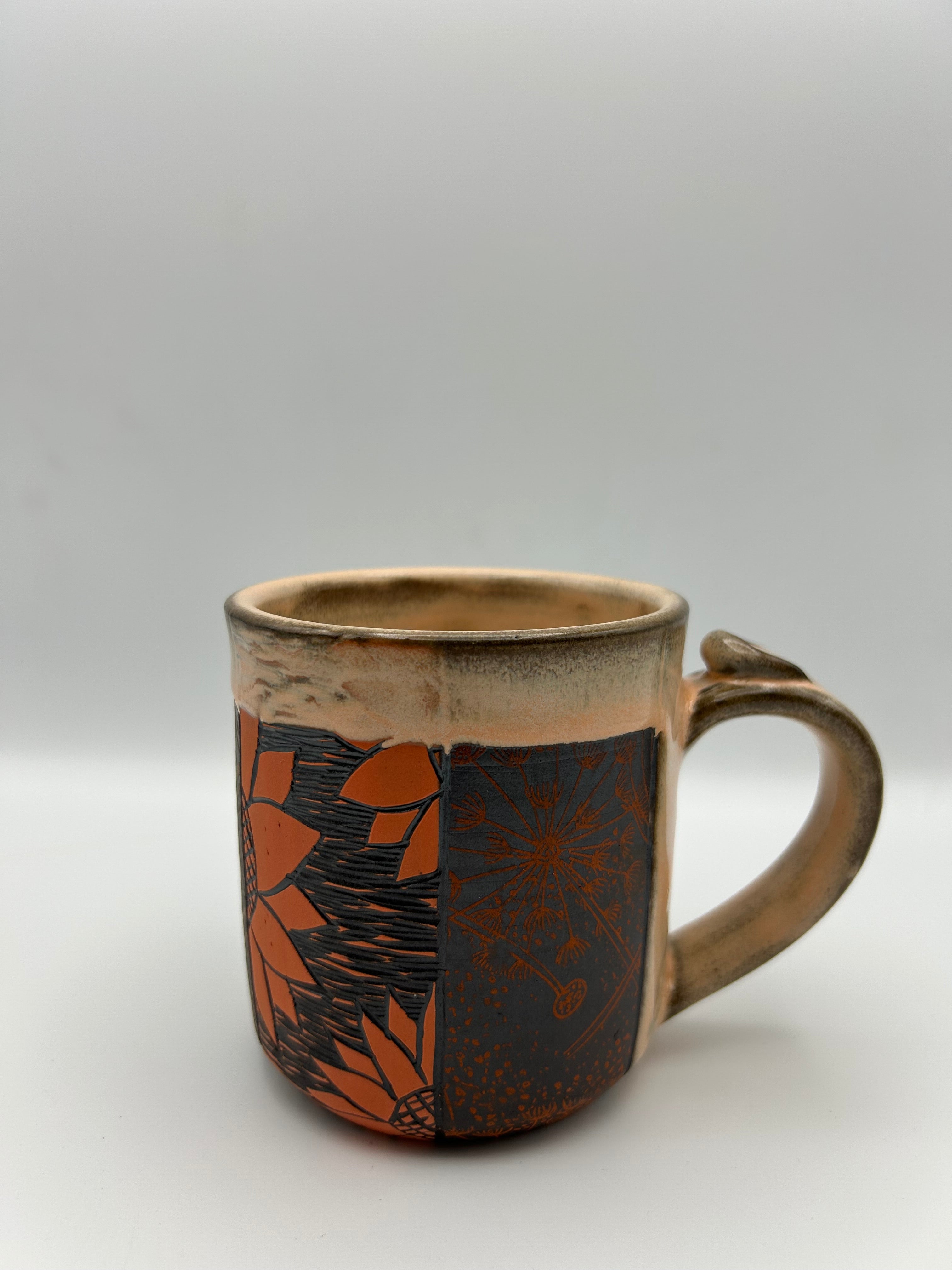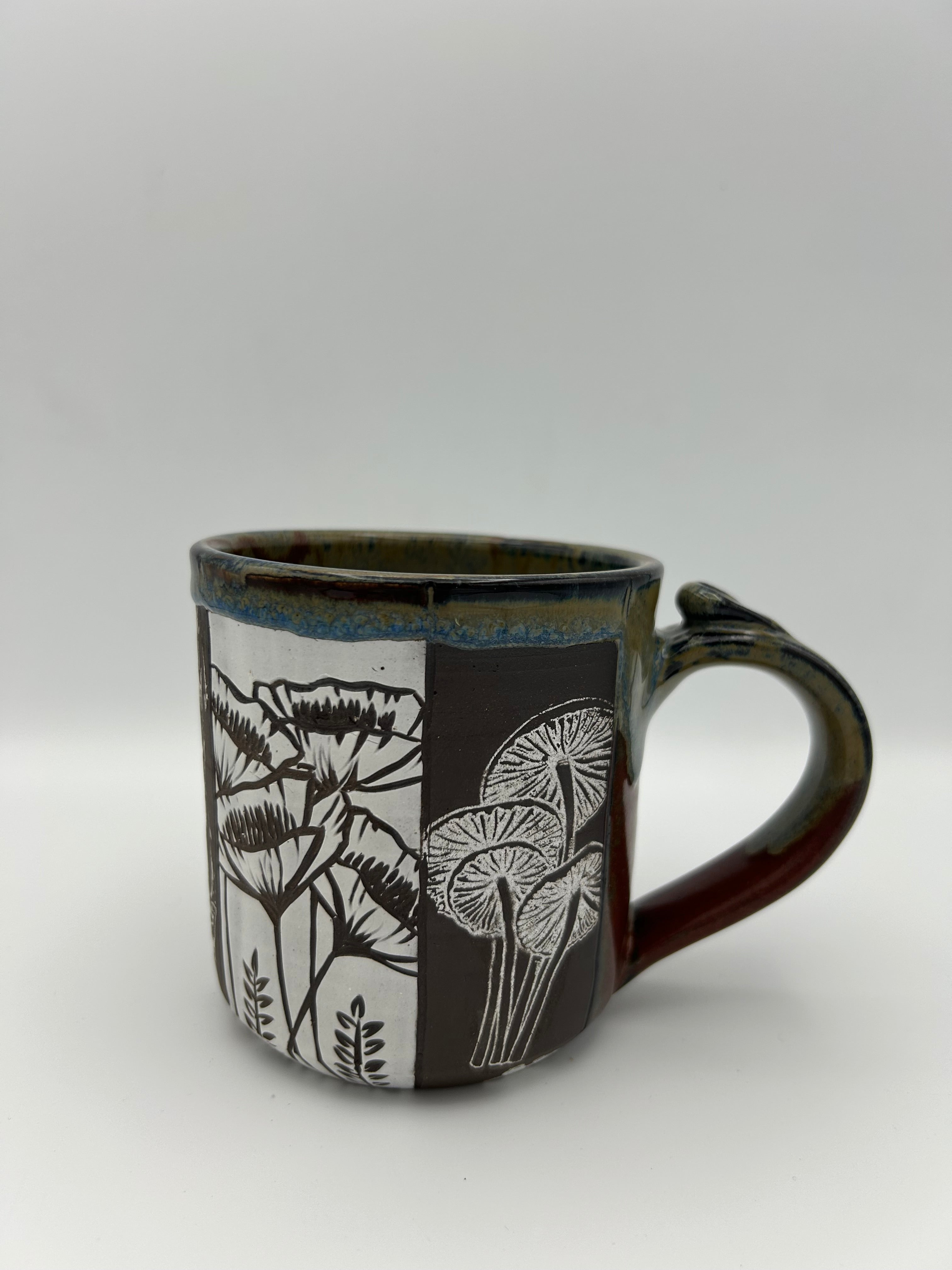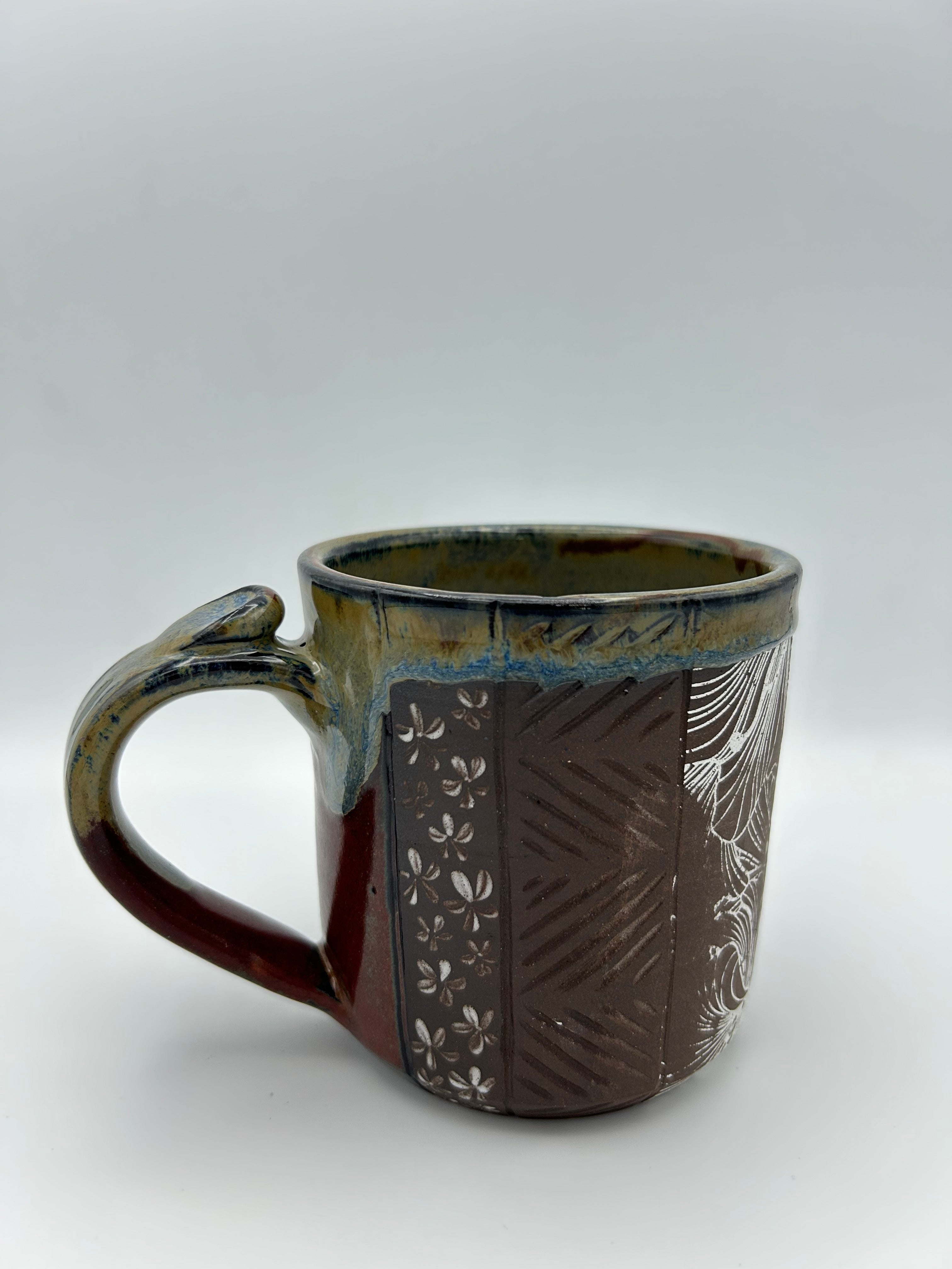 A combination of painting, carving, sgraffito, slip trailing, and transfers, these mugs are some of my very favorite to make. Each design is unique.
