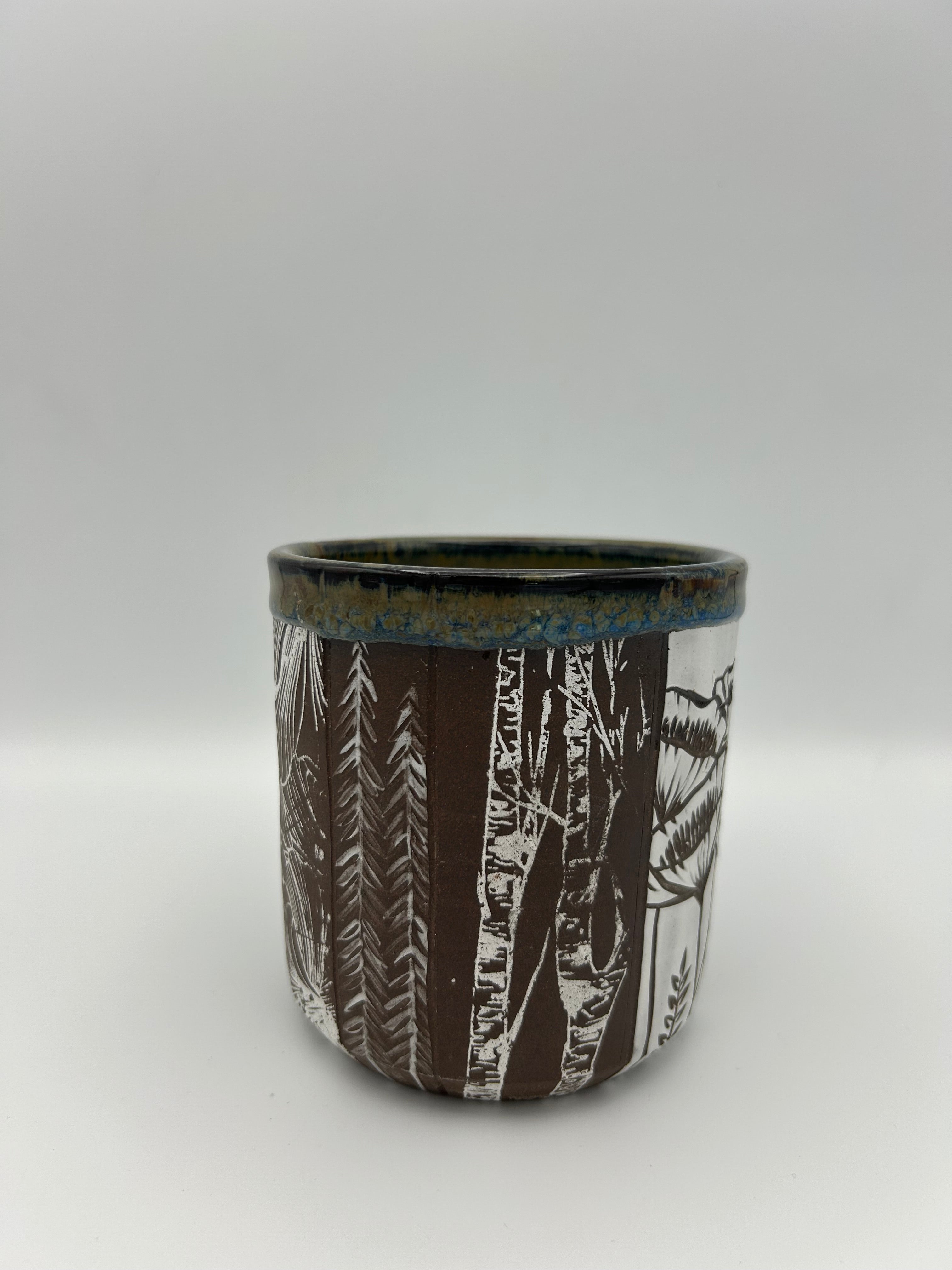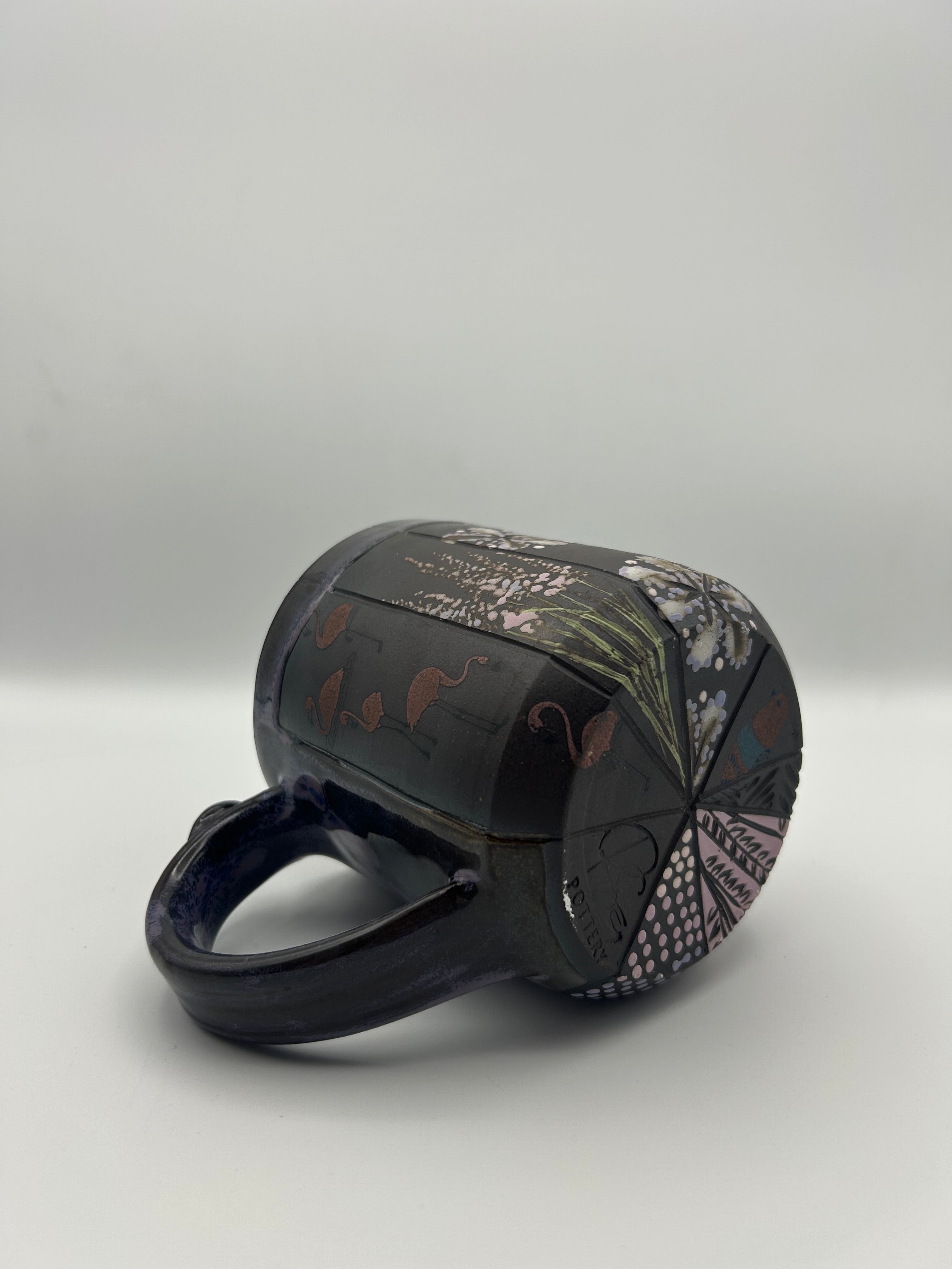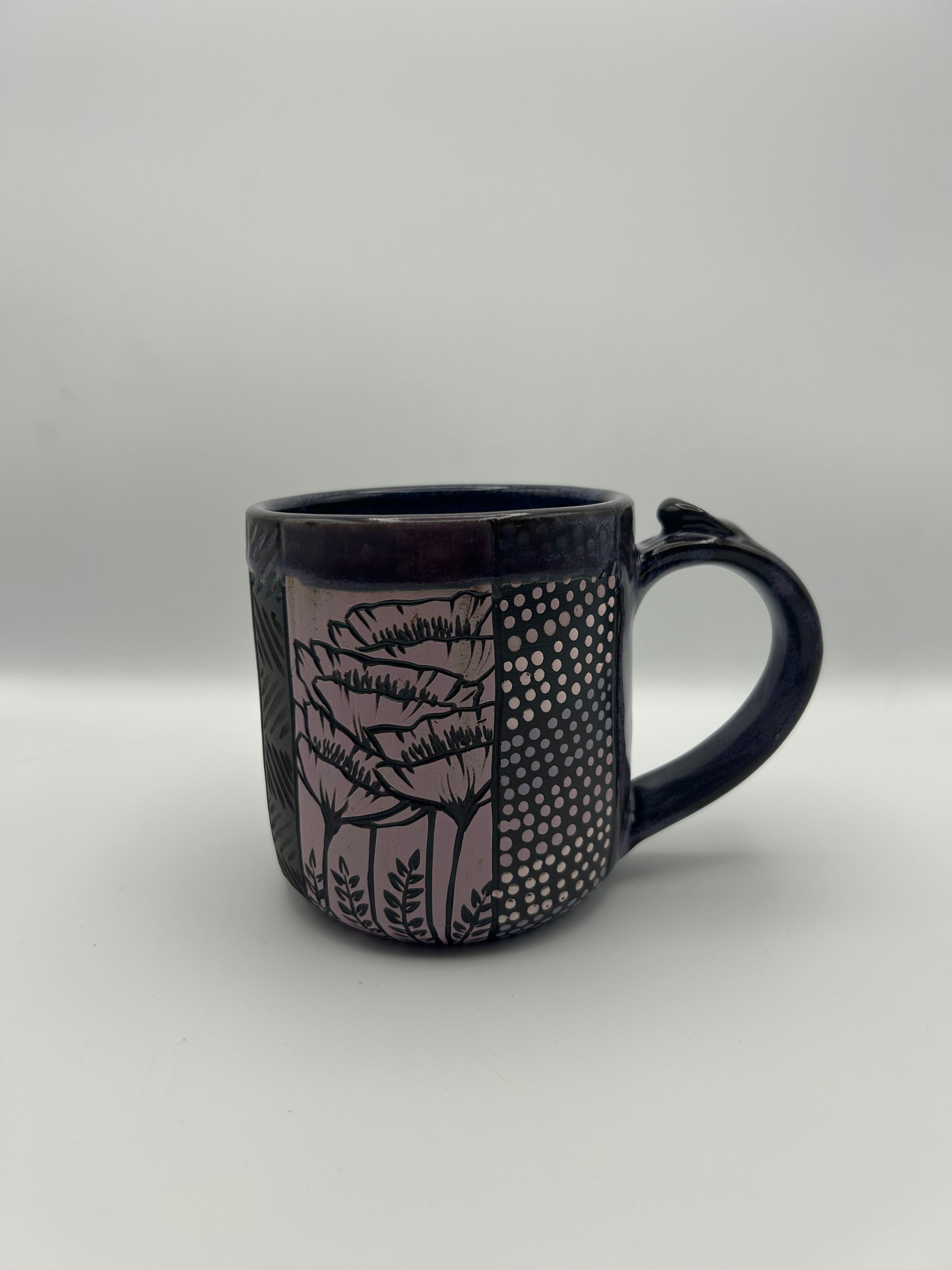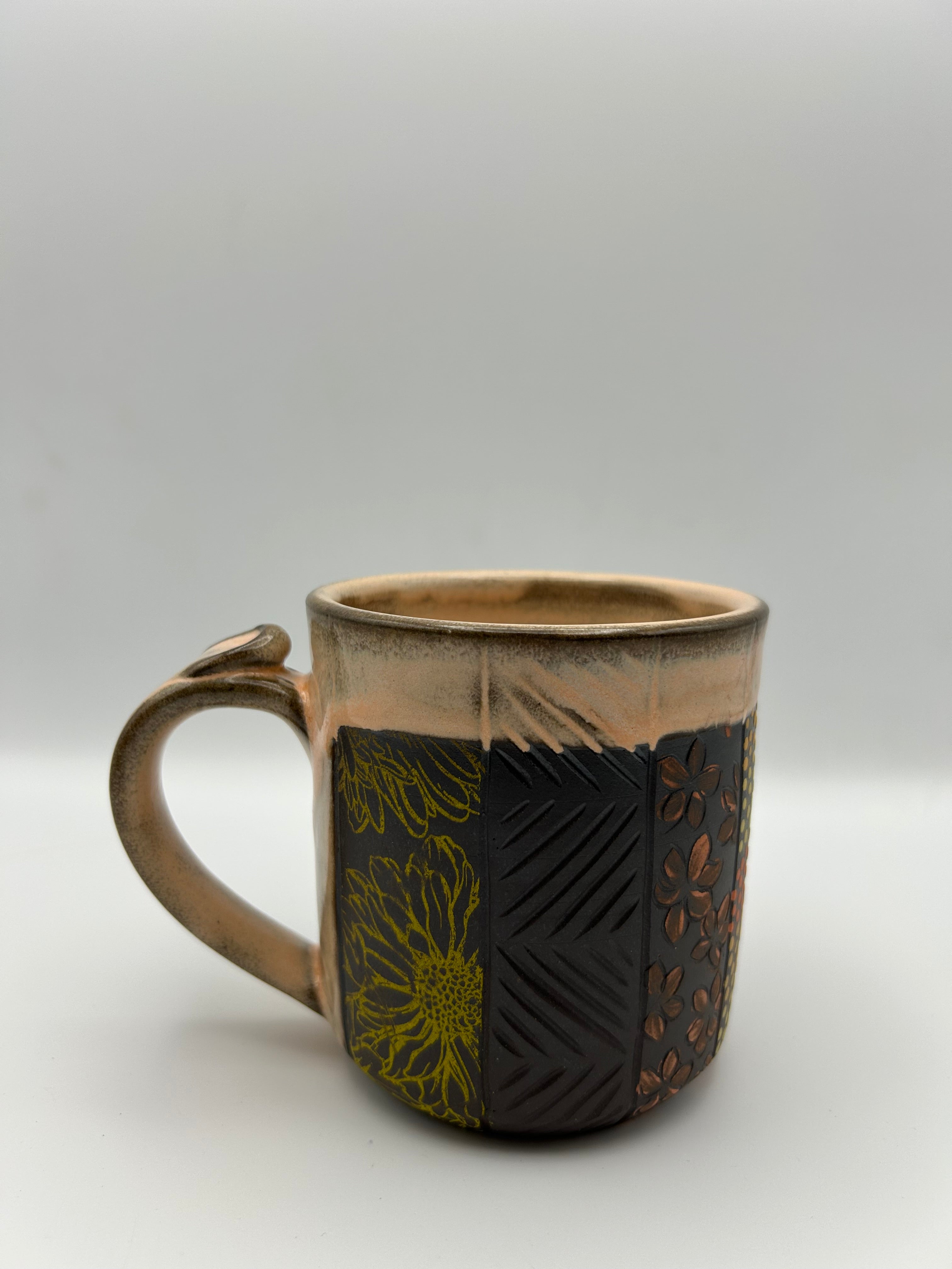 A combination of painting, carving, sgraffito, slip trailing, and transfers, these mugs are some of my very favorite to make. Each design is unique.