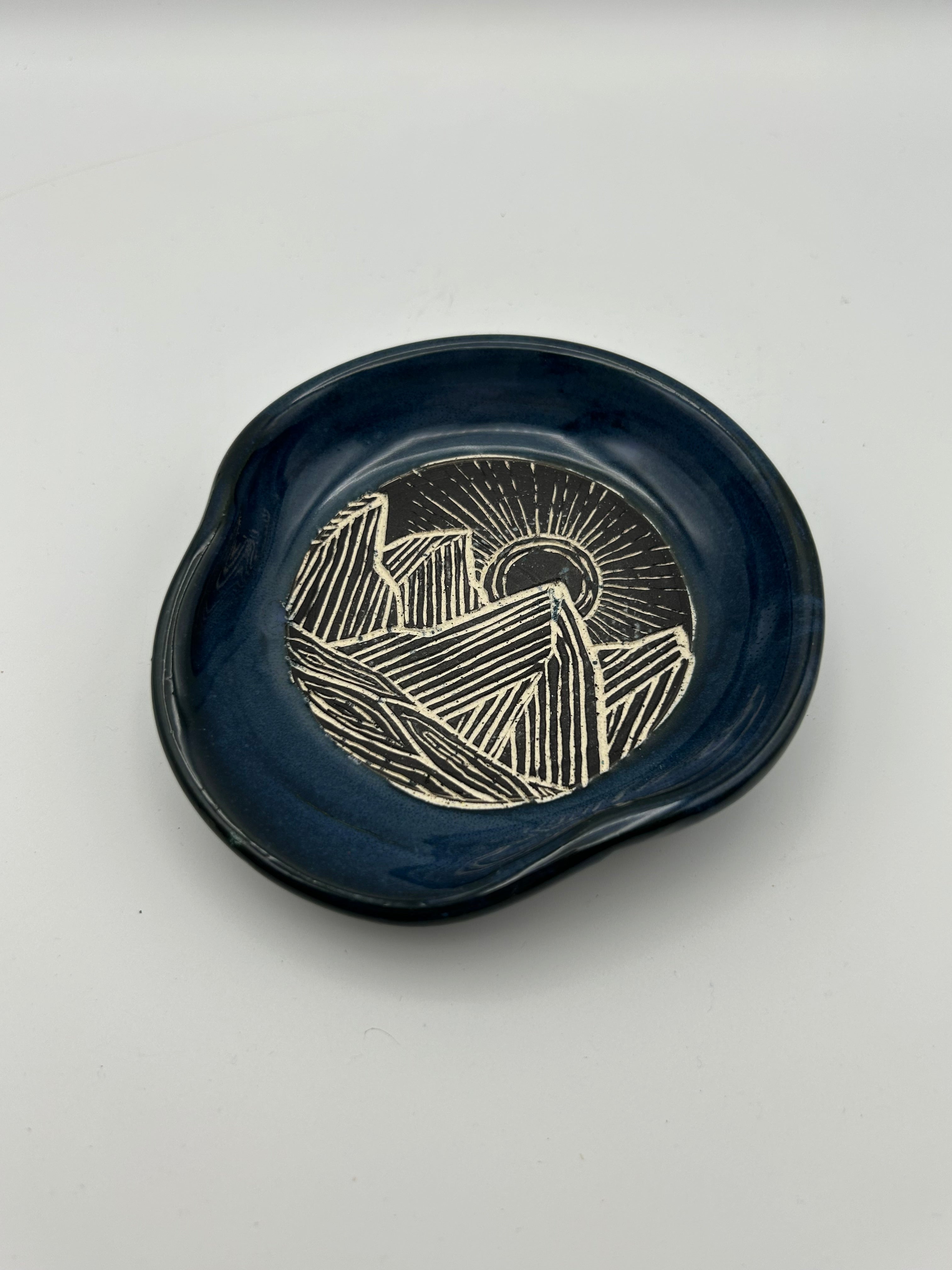 Sgraffito Lined Mountains Spoon Rest - Dark Blue