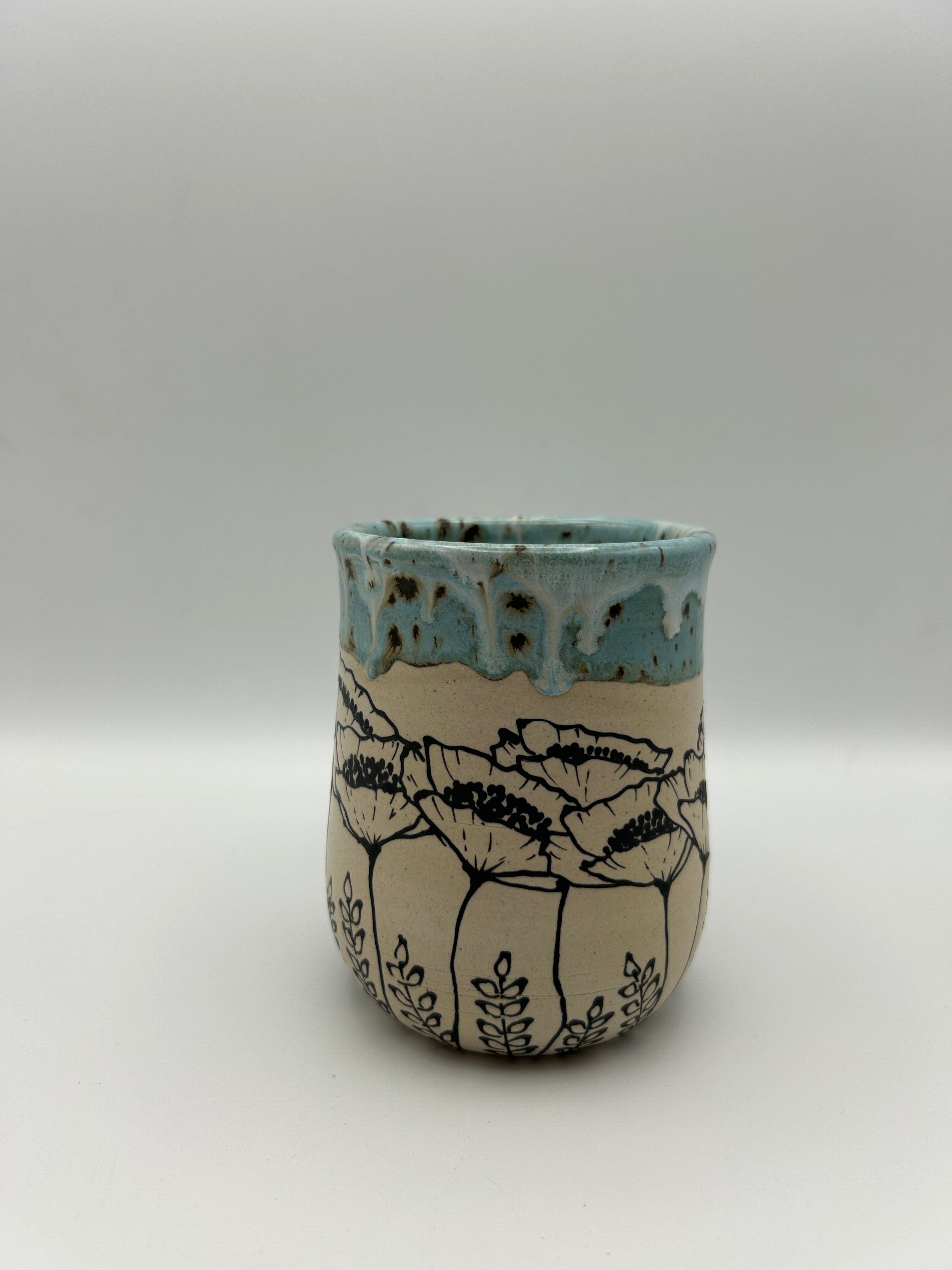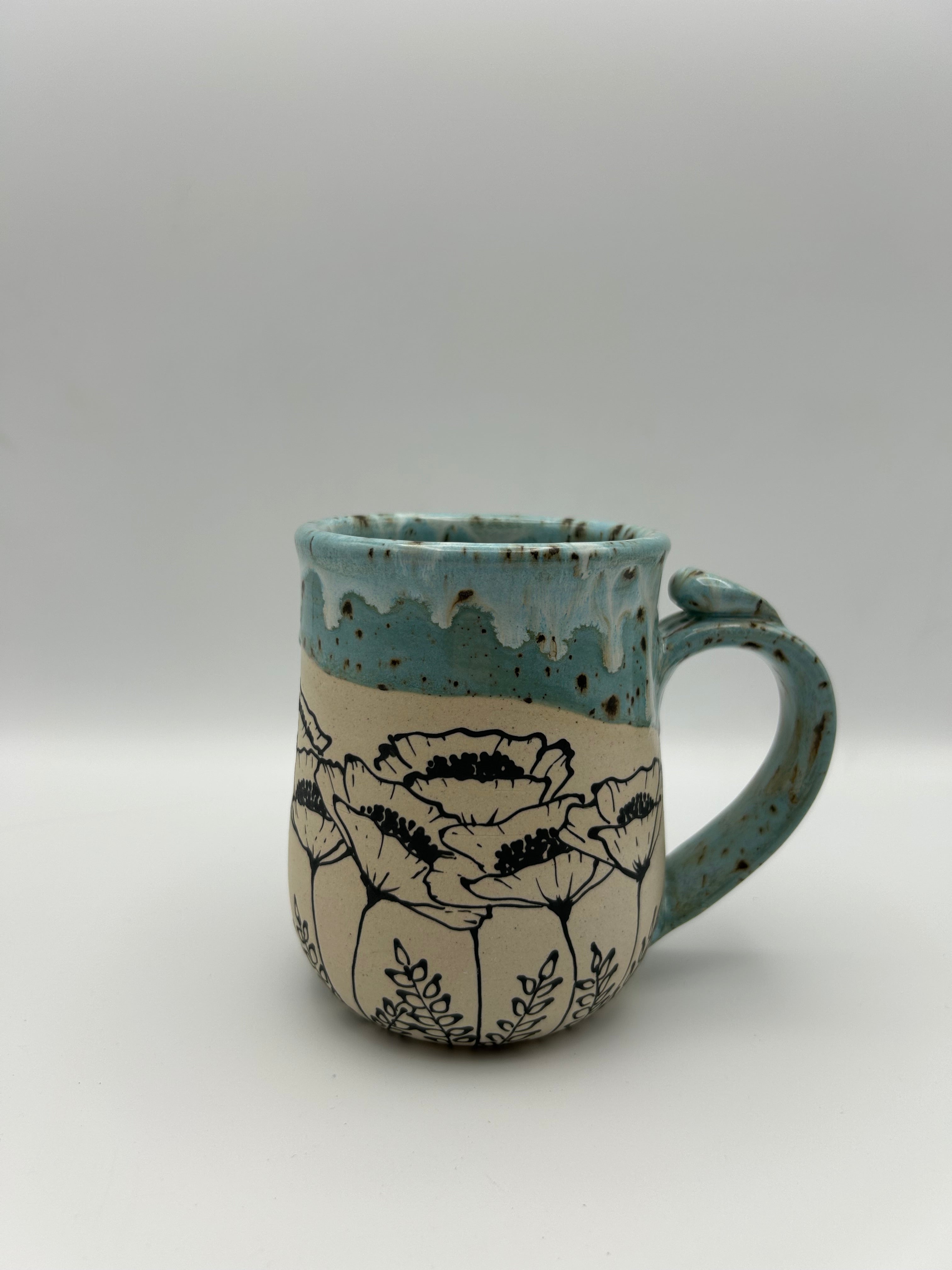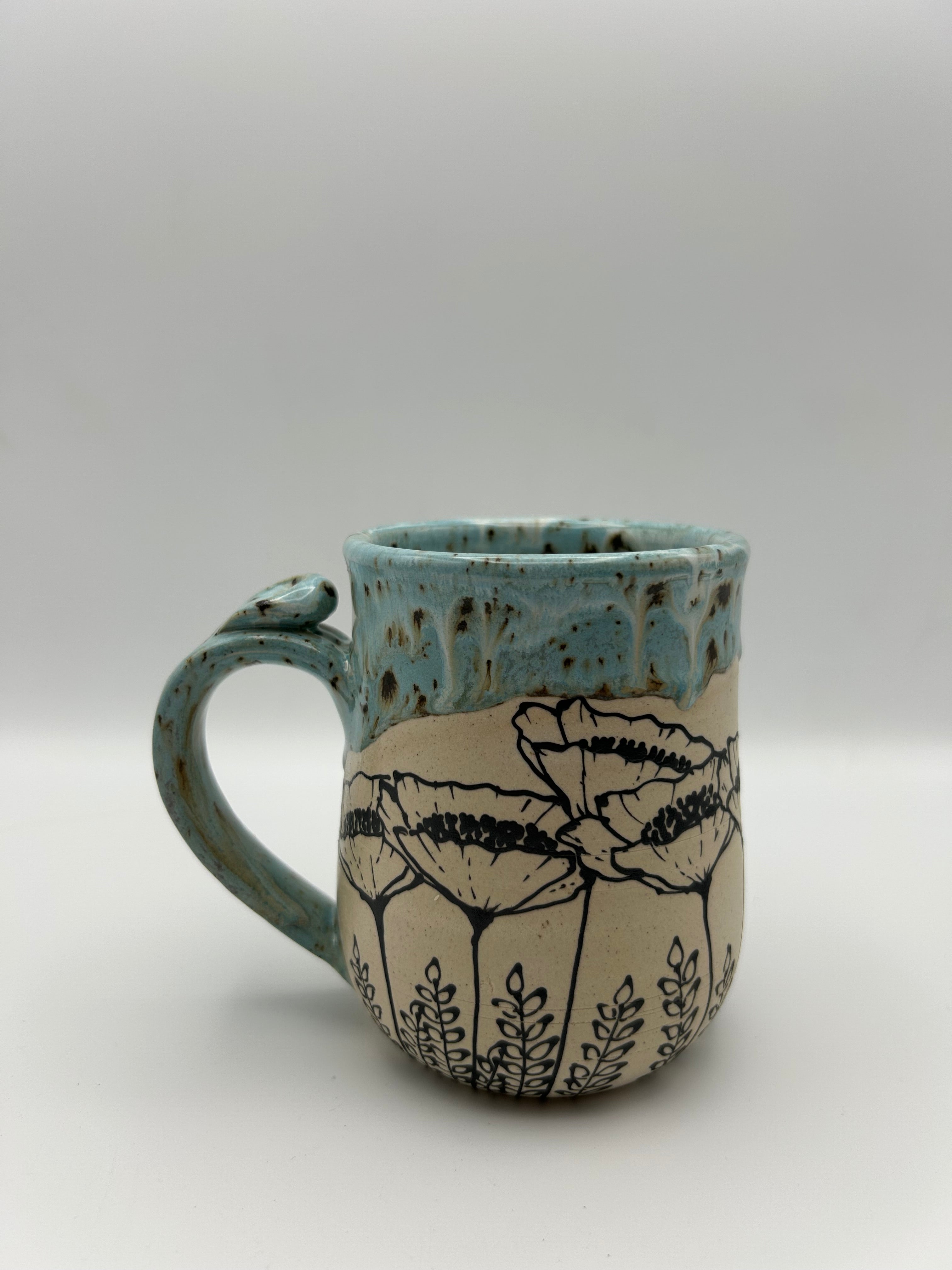 Hand drawn poppies makes this mug a beautiful way to drink your coffee.